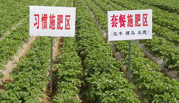 河南鄭州市滎陽高村農(nóng)民黃海望,共種6畝馬鈴薯,其中5畝用的眾德套餐,眾德生物有機肥80公斤,15-10-20高鉀型眾德牌摻混肥100斤在翻地前施用,100斤15-10-20高鉀型眾德牌摻混肥種肥同播,出苗后用態(tài)康科250倍液噴施兩次,另外一畝做對照,同等有機肥,100公斤15-15-15含量的復合肥作底肥。施用眾德牌摻混肥的馬鈴薯莖葉不旺長,發(fā)根早、根粗、苗壯,中期苗高比對照高15-20厘米,長勢好、病害少,收獲時馬鈴薯個頭大、品質(zhì)好、表面光滑,上市早,賣價高,產(chǎn)量比對照高58-60%,畝產(chǎn)達到6100多斤。